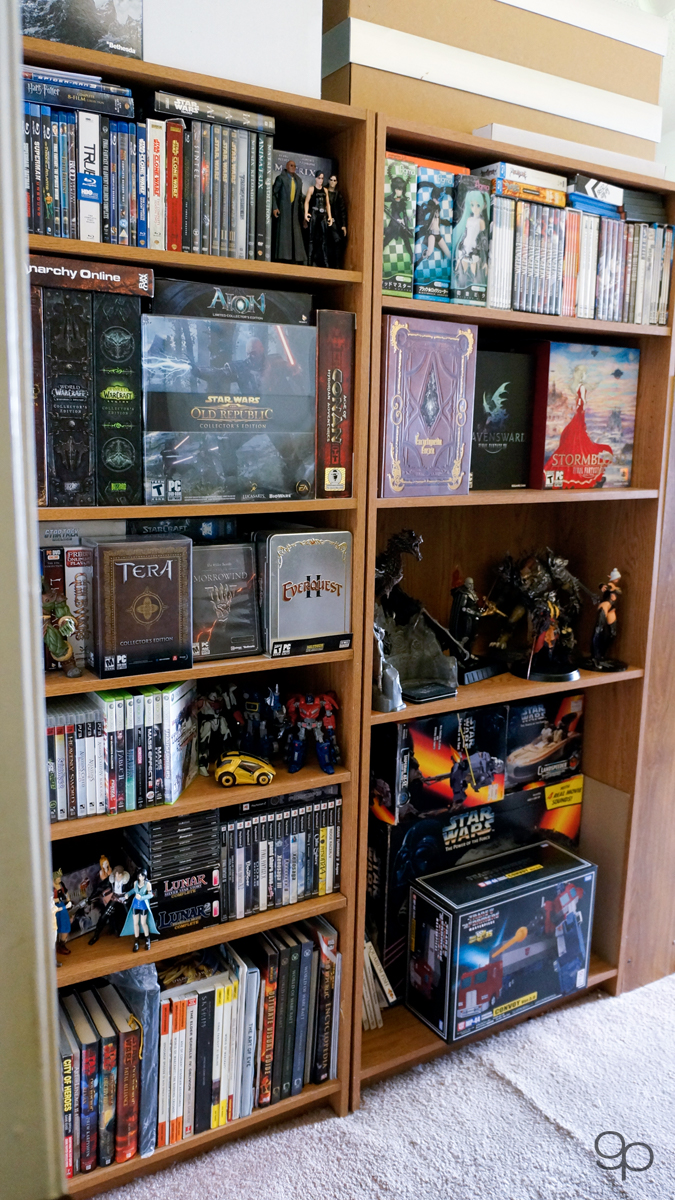 In my old shelves I still have my video game collection, mostly filled with large MMO collector’s edition boxes. I also have some DVDs, Blu-Rays, Anime, and consoles games. I moved things around a bit and added a couple related collectibles and gaming statues.