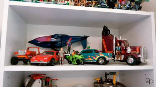Finally on the last two shelves are a lot of older items. In the little shelf I have my growing collection of old 80s cartoon DVDs and some books from Star Wars/Trek to Lego and Transformers. On the big shelf I have more Lego Ninjago Lego sets and then my remaining Mask toys from my childhood. Then there are two shelves of my StarCom toys, a rather obscure series, but one I loved as a kid and probably sparked my interest in space. Then I have what’s left of my collection of Dino-Riders. And last there are boxed Star Trek toy sets and an original K.I.T.T. car.